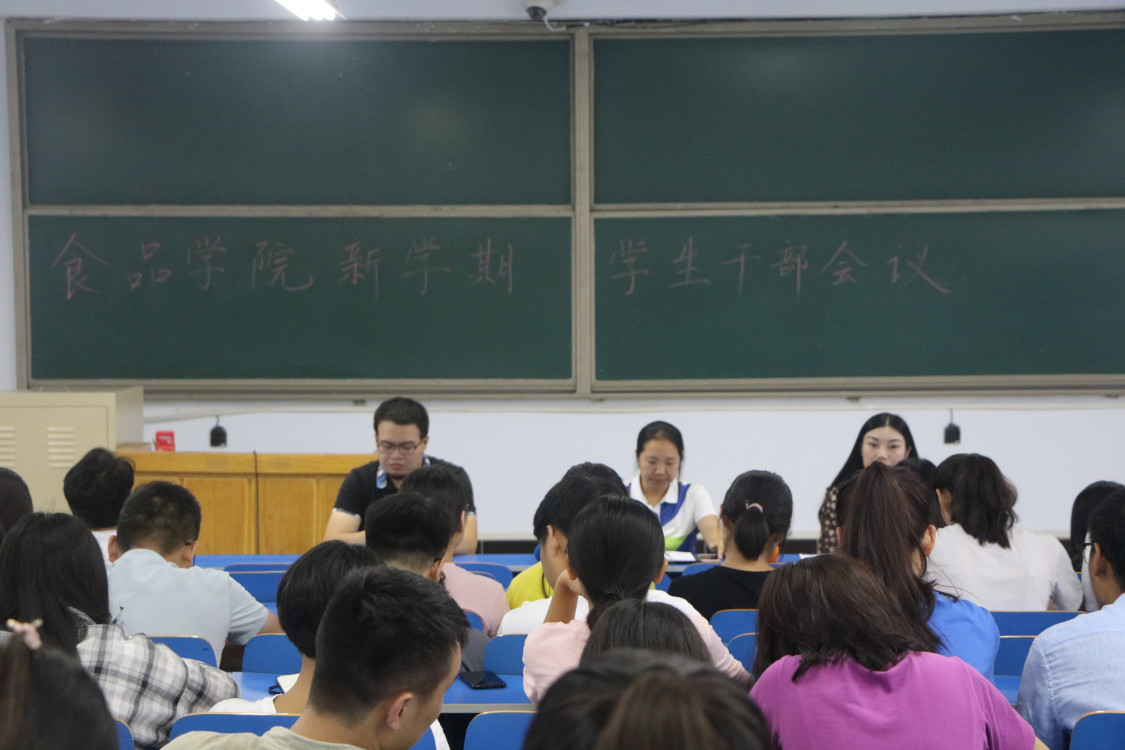团委于9月2日下午五点钟在四合三教室召开新学期全体学生干部会议。食品学院团委书记王明艳老师、16级辅导员陈思老师、18级辅导员牛李臣老师以及全体学生干部参加了会议。