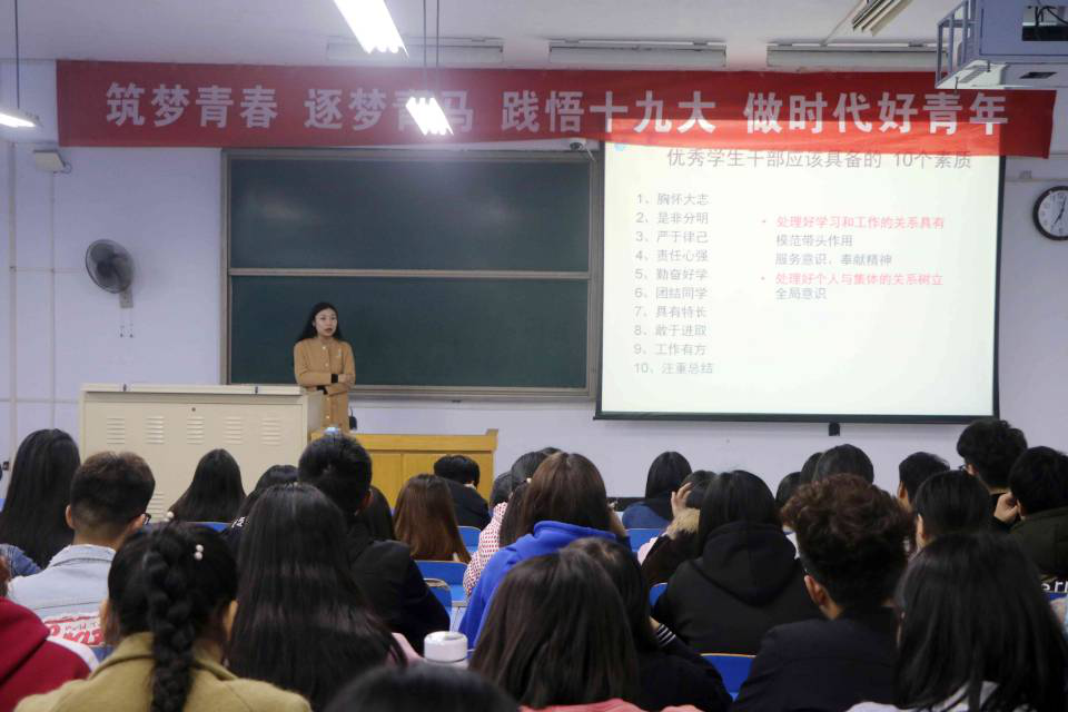 团学干部是组织广大同学积极开展各项活动的核心力量,为使各班团干能更好的管理班级,为广大同学提供更优质的服务,11月14日晚七点半,太阳城网址(中国)官方网站 辅导员陈思老师在四合二教室为青年团干做专题讲座。