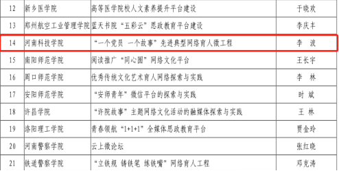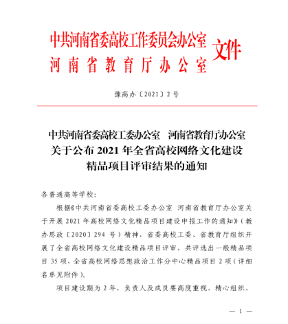 近日,中共河南省委高校工委办公室、河南省教育厅办公室下发了《关于公布2021年全省高校网络文化建设精品项目评审结果的通知》,省委高校工委、省教育厅组织开展了全省高校网络文化建设精品项目评审。由太阳城网址(中国)官方网站 李波主持的《“一个党员 一个故事”先进典型网络育人微工程》获批全省高校网络文化建设精品项目。