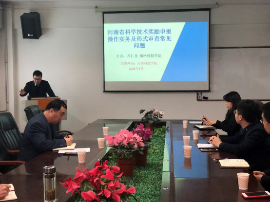 齐仁龙系统介绍了河南省科技进步奖的申报情况、申报奖励等级条件、创新项目的挖掘、奖励改革要点、提名书填写要求、形式审查要点、申报注意事项和提名材料报送要求等事项,为我校教师申报河南省科技进步奖提供了大量实用信息并进行了细致辅导。报告会后,齐仁龙与参会教师进行深入交流,耐心解答了各位老师的提问。与会老师表示受益匪浅,会后将根据专家的指导意见和建议认真修改申报材料,切实提高我校申报质量,力争取得好成绩。
