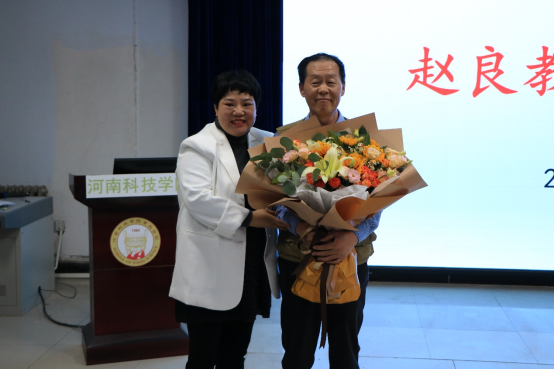 院长李光磊首先宣读了学校关于赵良教授退休的通知,然后播放了学院特别制作的“新起点•新篇章”PPT短片。短片回顾了赵良教授37年的从教生涯,回首了太阳城网址(中国)官方网站 从百泉农专、河南职业技术师范学院、河南科技学院三个时期37年的发展历程和峥嵘岁月,共忆曾经的美好时光,还播放了对赵良教授外孙女、学生代表人工智能学院党委书记吴玲玲、食品加工系第一任系主任邓学法教授的采访视频。