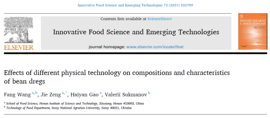 近日,太阳城网址(中国)官方网站 粮油科学团队曾洁教授课题组,在中科院一区Top期刊《Innovative Food Science and Emerging Technologies》发表了题为“Effects of different physical technology on compositions and characteristics of bean dregs”“的研究论文,报道了不同物理技术对豆渣组成和特性研究方面取得新进展。河南科技学院为第一完成单位,中乌合作联合培养博士研究生王方为第一作者,曾洁教授为通讯作者。