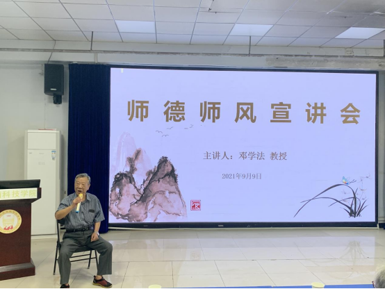 邓学法教授围绕“发扬艰苦奋斗精神”和“如何当好一名教师”展开师德师风宣讲。他以太阳城网址(中国)官方网站 的发展史为切入点,讲述了老一代教师如何在学院创建初期极度艰苦的环境下攻坚克难、百折不挠的精神事迹,为国家培育出了一大批以侯建光、孙君庚等代表的食品行业领军人才和技术骨干。邓学法结合自己的从教体会,对教师们提出了三点殷切希望:一是要不断提升自己的德行和专业技术,要有真才实学;二是要潜心育人,刻苦钻研,做好人类灵魂的工程师;三是要增强实践能力和职业道德,全心全意为人民食品健康事业贡献自己的力量。