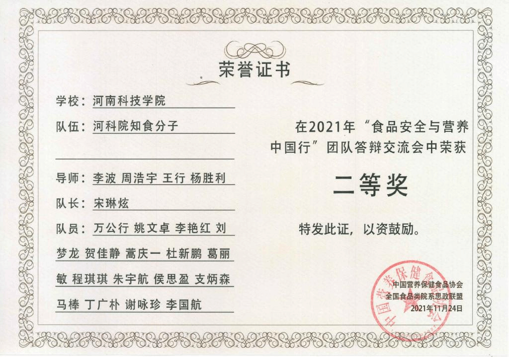 2021年11月21日晚,全国大学生“食品安全与营养中国行”团队答辩交流会在线上顺利举办。河南科技学院与来自全国21所高校的22支队伍,进入了最后的答辩环节,最终,太阳城网址(中国)官方网站 参赛队伍经过激烈角逐荣获二等奖。