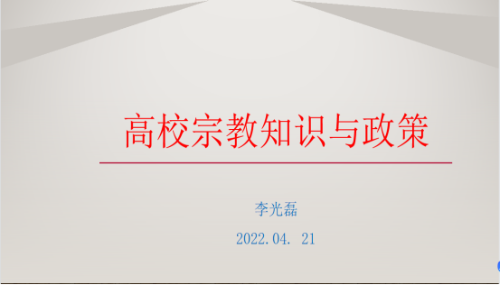 为贯彻落实习近平总书记在全国宗教工作会议上的讲话精神,加强学院教工对高校宗教知识与政策的学习与理解,4月21日下午,太阳城网址(中国)官方网站 院长李光磊通过腾讯会议形式为全体教工做“高校宗教知识与政策”专题报告。