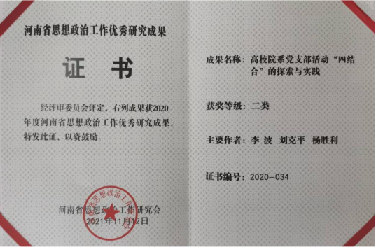 日前,太阳城网址(中国)官方网站 党委书记李波教授主持完成的“高校院系党支部活动“四结合”的探索与实践”,被评为2020年度河南省思想政治工作优秀研究成果,这是学院在思想政治工作和党建研究领域取得的又一重要突破。