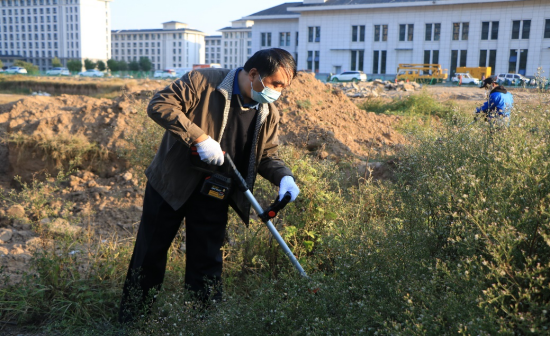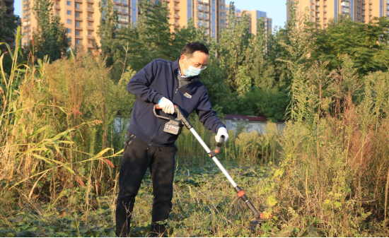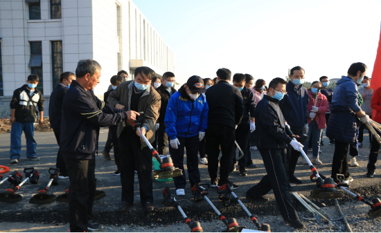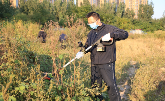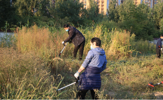 志愿活动以割草劳动为主。党委书记李波、院长李光磊、副书记刘克平率先垂范,拿起除草机深入杂草中,其他党员也纷纷拿起除草机和镰刀在杂草中穿梭。虽然杂草丛生、土丘嶙峋,但大家依旧干得热火朝天。除草机左右反转、镰起草落,在共同努力下鞫为茂草的景象变了个样。
