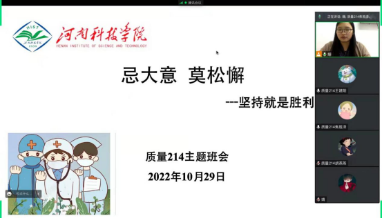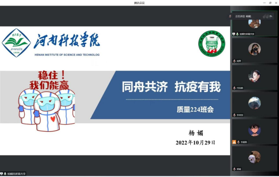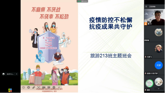 本次主题班会活动中,各班以“坚定、坚持、坚守、坚信”、“抗击疫情,慎终如始”、“疫情防控不松懈,抗疫成果共守护”等为主题,从以下几个方面向同学们提出建议和要求:一是传达新乡市教育系统新冠肺炎疫情防控工作专班办公室《关于进一步加强在新高校外卖快递管理的紧急通知》的要求,要求同学们不点外卖,减少网上购物,严格遵守学校疫情防控要求;二是建议同学们趁此机会,静心学习,认真上好网课,明确自己的学习目标,努力奋进;三是希望同学们坚持非必要不请假出校园,如确有特殊情况,要严格履行请假手续;四是鼓励学生党员、班干部、宿舍长做好榜样带头作用。