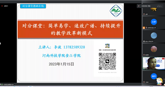 本次线上教研活动分为主题报告、小组讨论和提问对话等环节。首先,李波以“对分课堂:简单易学、速效广谱、持续提升的教学改革新模式”为题进行了分享,报告分为三部分:1.我为何要做对分课堂教改?我的对分实践之路;2.对分课堂的关键创新、特点优点;做好对分的注意事项;3.我为何要宣传、推广对分课堂?对分在河南科技学院的推广效果。李波以自己的亲身实践经历,从“一段经历、一份责任、一种追求”阐述了选择对分课堂进行教学改革的原因,介绍了对分课堂的基本模式、操作流程、核心理念、关键创新、特点优点和注意事项,隔堂对分和当堂对分在专业课、专业导论课、党课、研究生课程、线下和线上课的改革实践效果,对分课堂在我校的宣传、推广成效,并鼓励广大教师尽早实践对分、早日打造金课。
