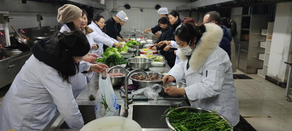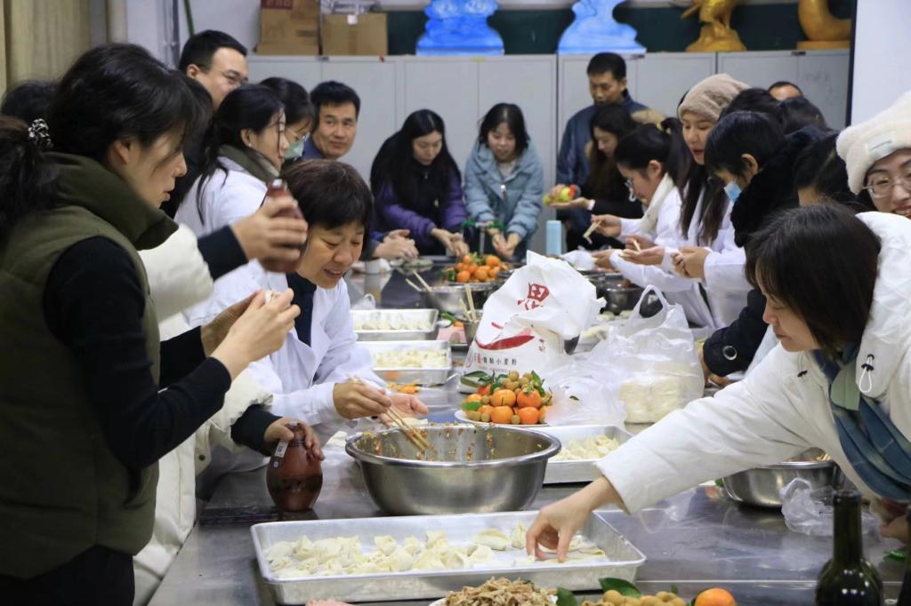 活动开始前,教师们一起回顾了一起走过的2023年。随后,大家以教研室为单位分工协作,摘菜洗菜,娴熟地包好一个又一个的特色饺子。一个个饱满的饺子,包着的不仅仅是鲜美可口的馅料,更是一份份满满的情谊。老师们还纷纷大展厨艺,把“当家拿手菜”展示给大家,油焖大虾、可乐鸡翅、萝卜炖牛腩……现场大家都充当评委,相互品尝,交流着厨艺,一桌子的美味佳肴被大家一抢而光,欢声笑语融在一起,各个脸上都洋溢着灿烂的笑容。