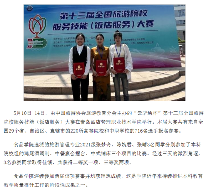 学生在第十三届全国旅游院校服务技能(饭店服务)大赛中获佳绩