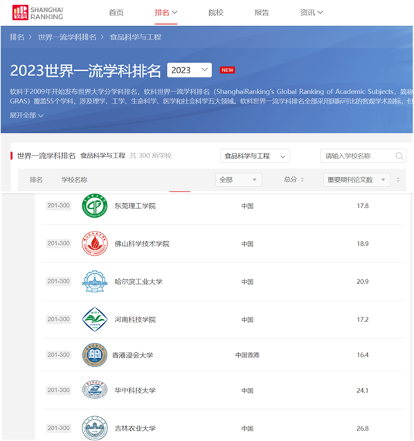高等教育评价专业机构软科正式发布2023“软科世界一流学科排名”,我校食品科学与工程学科上榜软科世界一流学科排名。