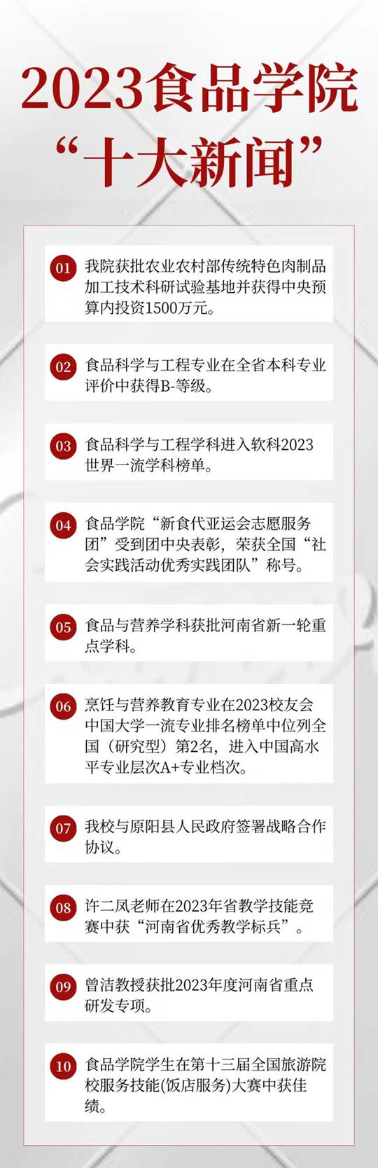 河南省教育厅公布了《新一轮河南省重点学科名单》(教研[2023]414号),食品与营养学科获批为新一轮省级重点学科。
