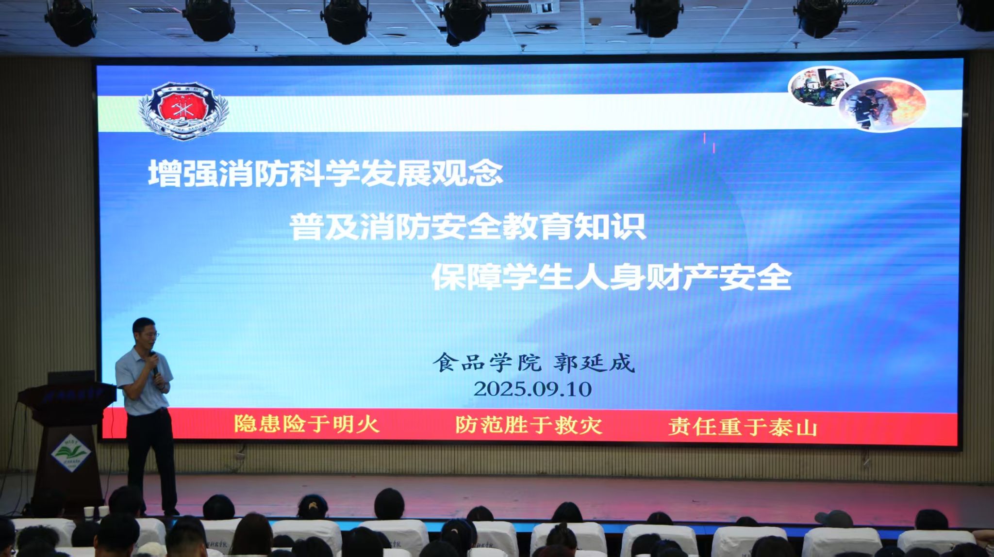 讲座首先聚焦消防安全,通过真实案例深入剖析火灾的严重危害性,警示新生“消防安全无小事”。宿舍作为学生生活的重要场所,是此次安全教育的重点环节。讲座上,郭书记通过一张张照片,明确了宿舍安全的“红线”,包括严禁使用任何违规电器、严禁在床上私拉电线、严禁在被褥里充电,务必做到人走断电,严禁使用明火(如点蜡烛、燃蚊香、燃烧物品)、严禁存放易燃易爆物品及管制刀具等。