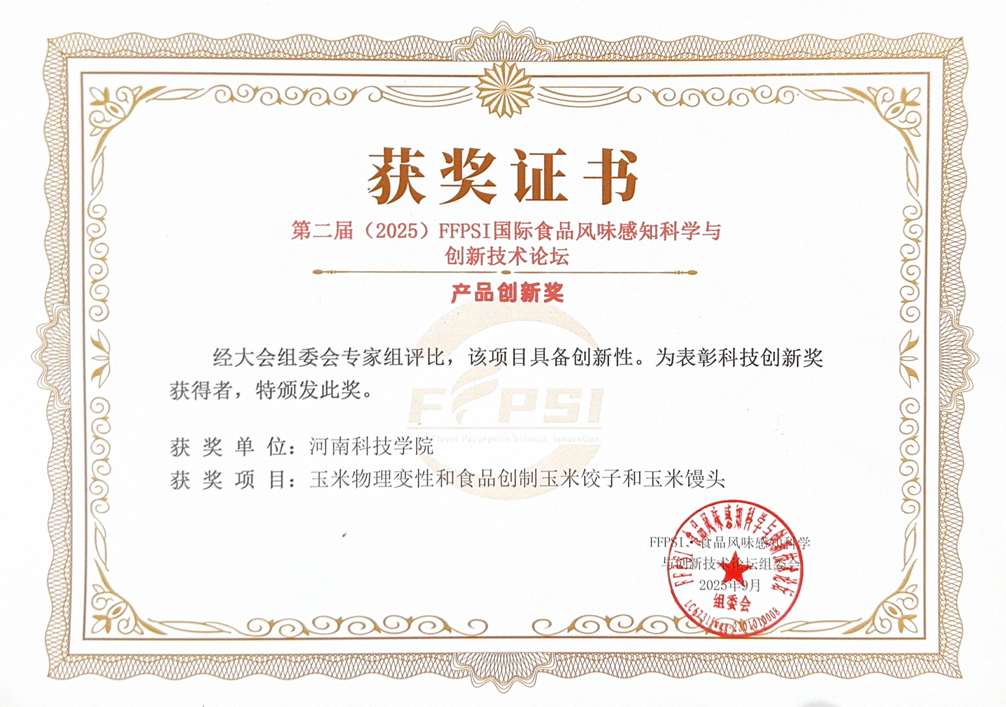 太阳城网址(中国)官方网站 “玉米物理变性和食品创制关键技术研究与产业化” 河南省重点研发专项主持人曾洁教授研发的新产品“玉米饺子和玉米馒头”凭借卓越的创新性与应用价值,获FFPSI2025国际食品风味感知科学与创新技术论坛产品创新奖。