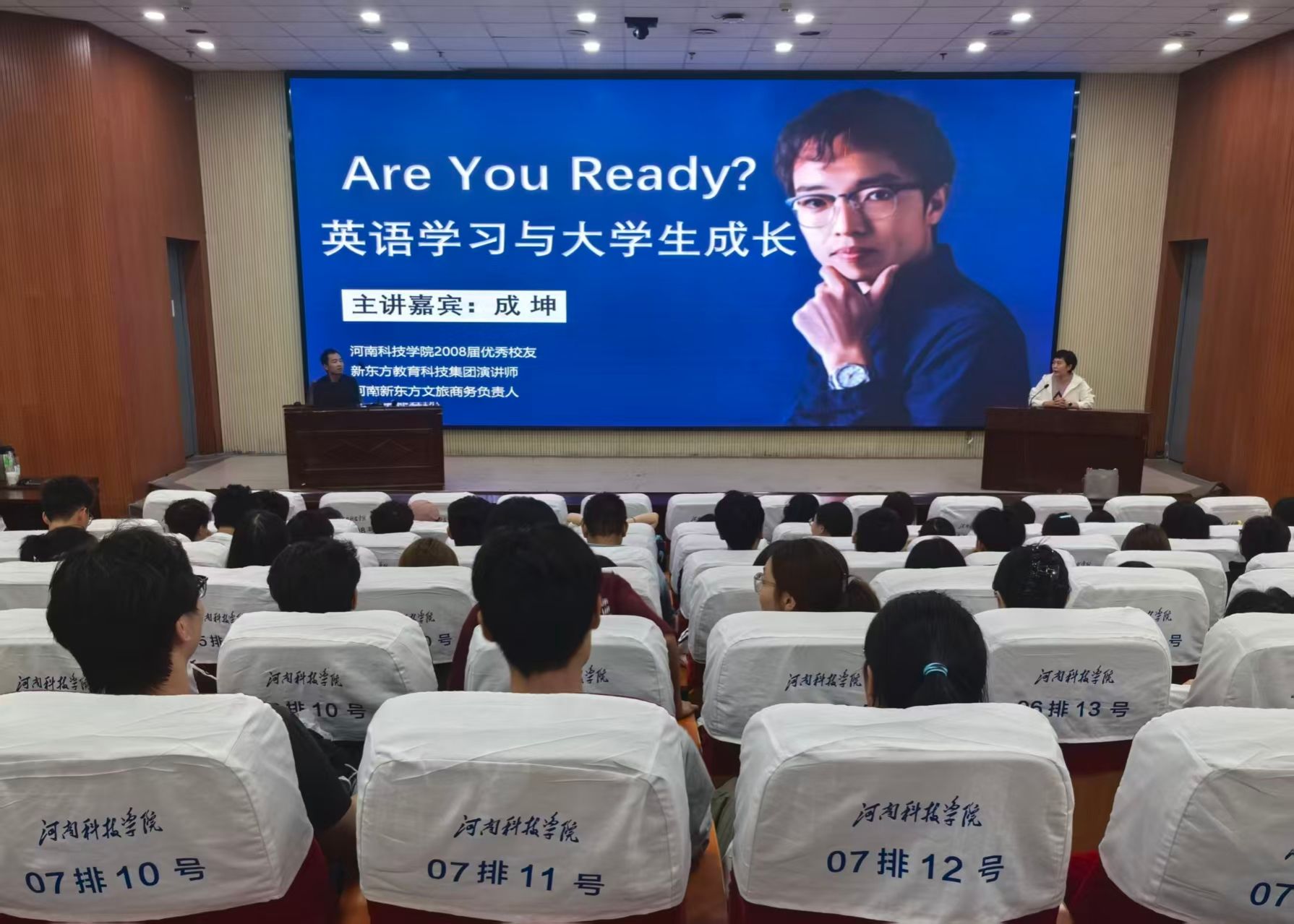 9月27日,太阳城网址(中国)官方网站 在图书馆学术报告厅为2025级全体新生举办了“英语学习与大学生成长”的职业生涯教育专题讲座,邀请2008届校友、新东方教育科技集团演讲师、河南新东方文旅商务负责人成坤担任主讲。2025级新生200余人参加,本次讲座由陈腾主持。